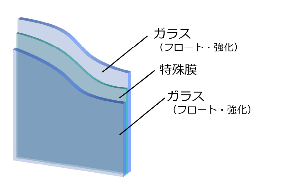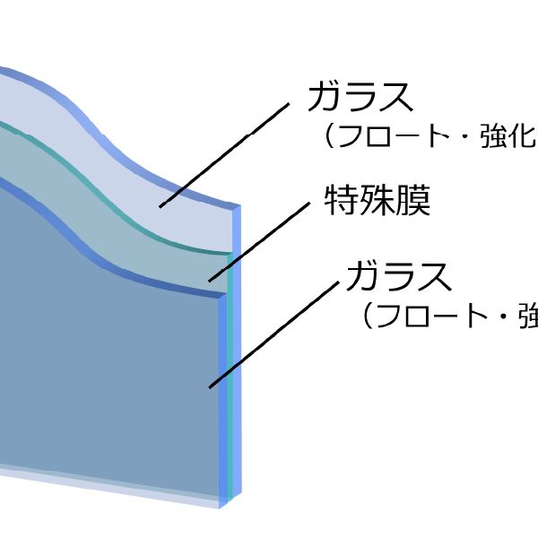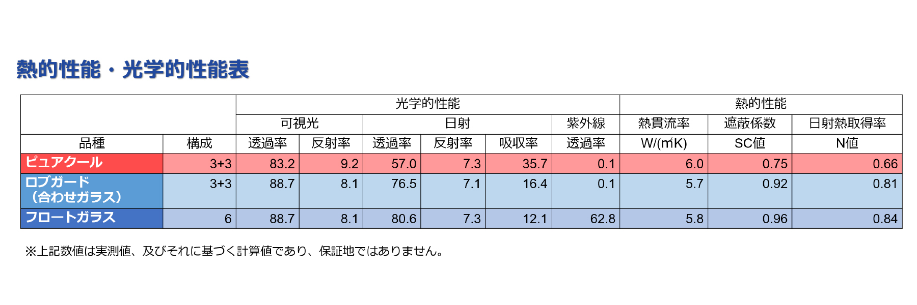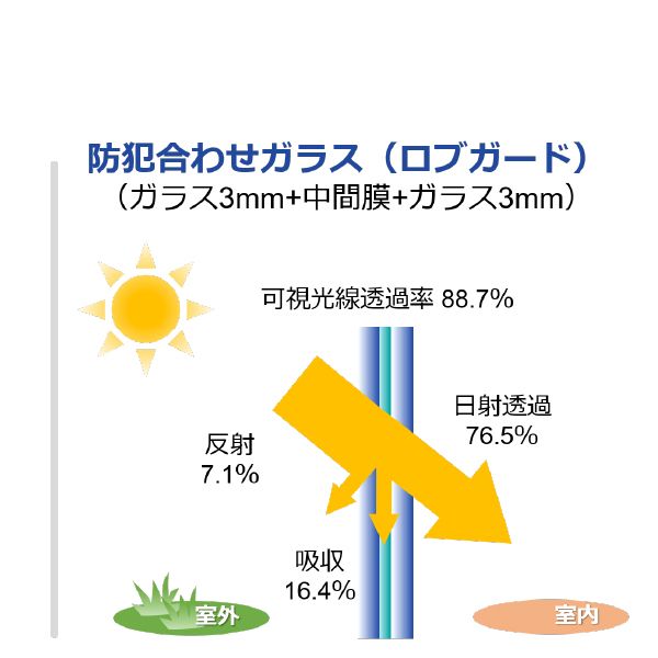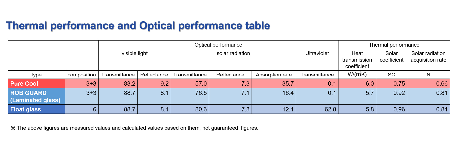 従来の合わせガラス機能である、紫外線(UV)、防犯はもちろんのこと、新機能として赤外線(IR)カットを実現しました。