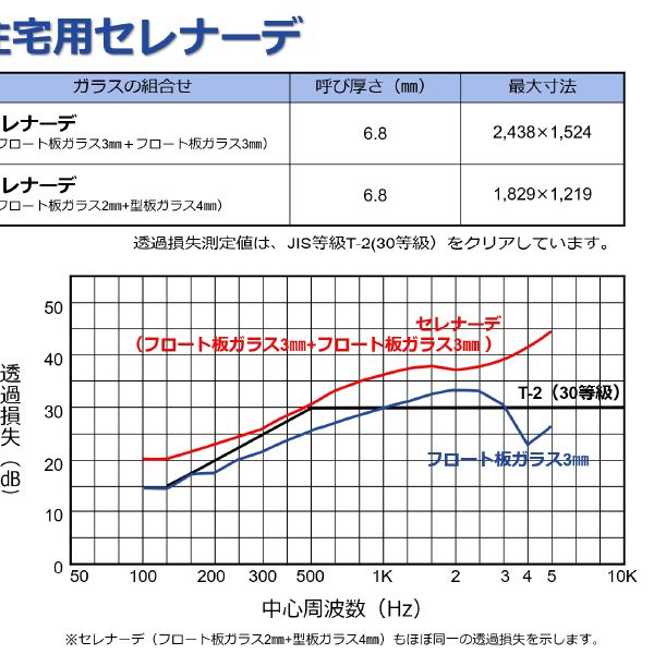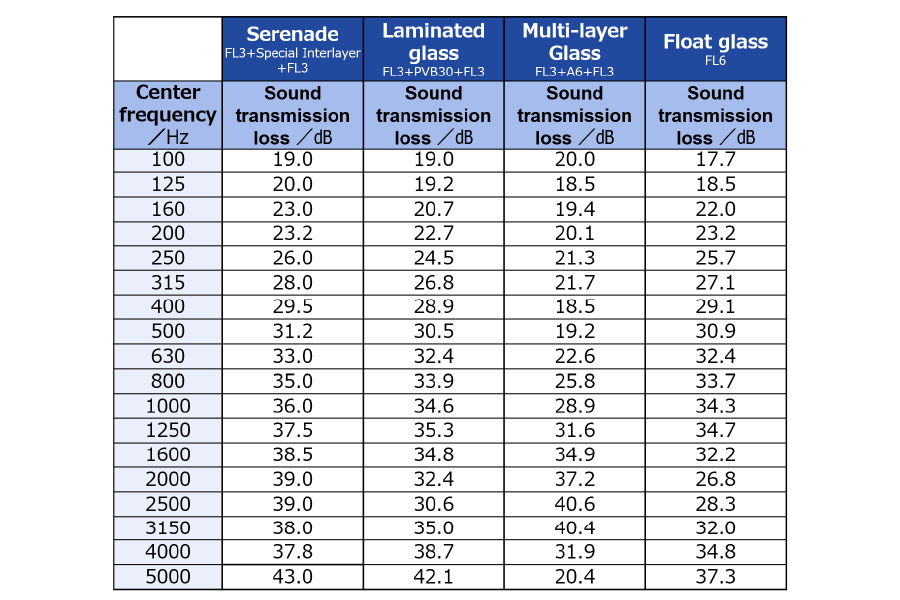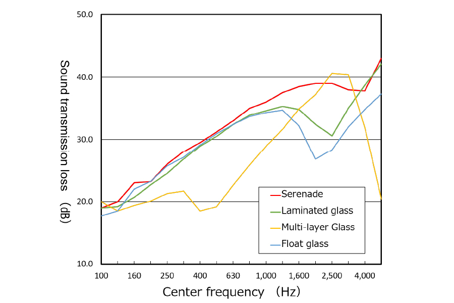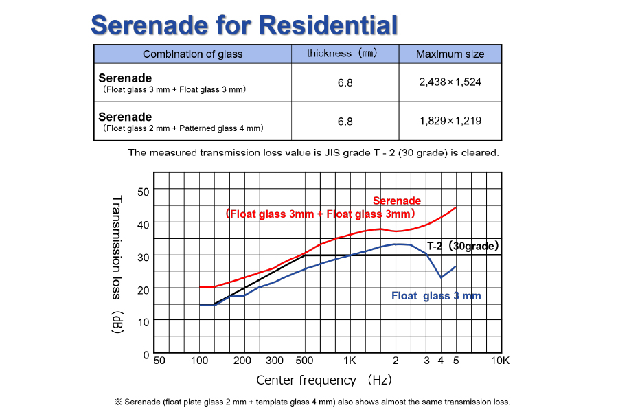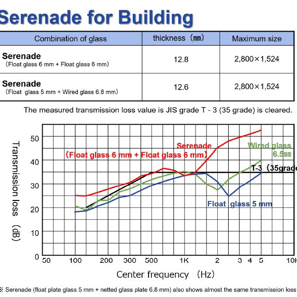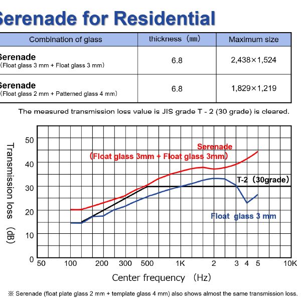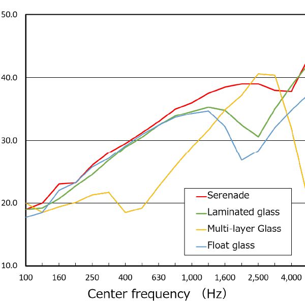 セレナーデは、フロートガラスを特殊な中間膜によって接着し、全音域にわたって高い遮音性を持つ防音合わせガラスです。
