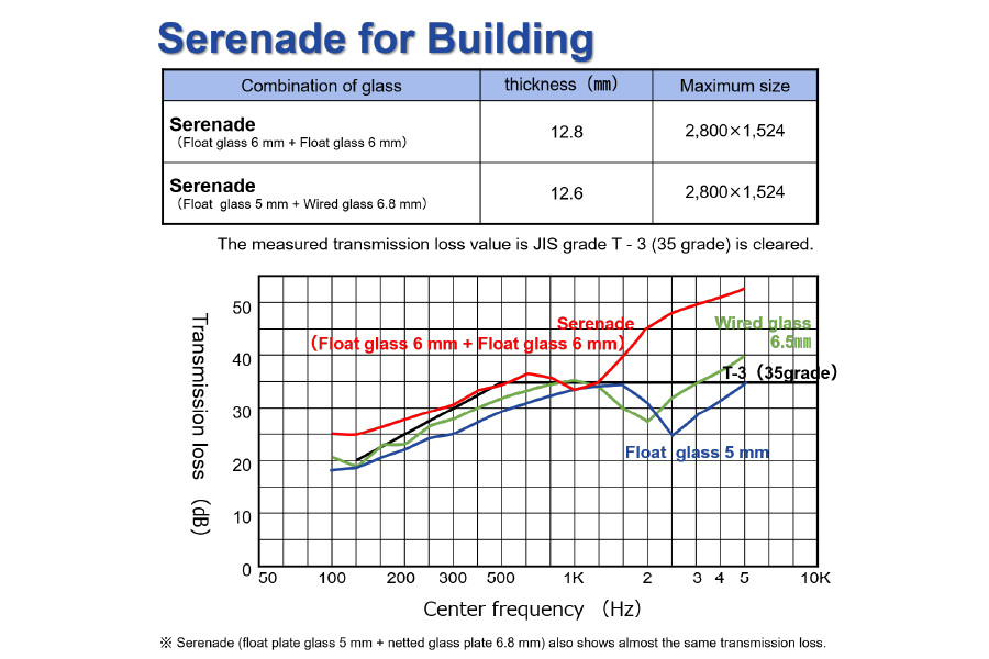 Serenade is a soundproof laminated glass with floating glass adhered by a special interlayer film and having high sound insulation properties over the whole range. By using it as an opening of a house window or an opening of a general building such as an office building, it is possible to design quiet and comfortable space.