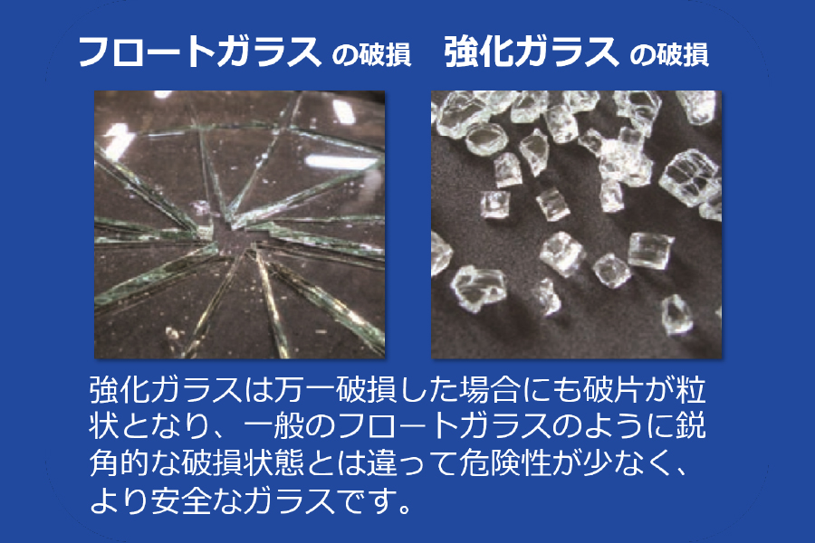 安全性万一破損しても、破片が細かい粒状になり、普通のガラスのような鋭い破片が生じません。このため破片による大けがを防ぐことができます。